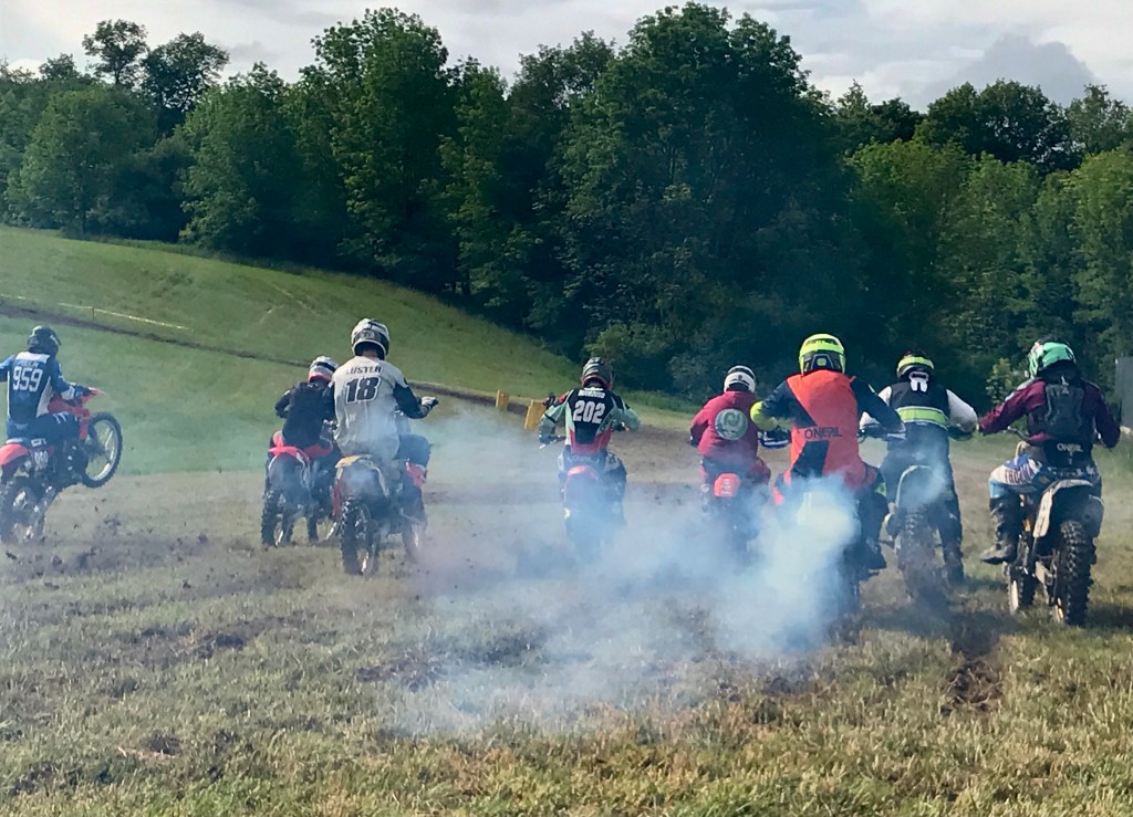 “The priority today is having fun,” event coordinator and vintage racing mover/shaker Fred Guidi said at a morning rider’s meeting. True, there’s no shortage of friendly bench racing and bonfire talk – including a few “The other side sucks!” taunts – at the close of each day. Before those guards get let down, however, you’re pinning it to the limit, receiving and delivering a faceful of roost in nose to tail competition. Those mists of time that obscure New Berlin for one weekend every June are, in this case, the snarls and swirls of 2-stroke smoke. Wake up and smell the pre-mix.