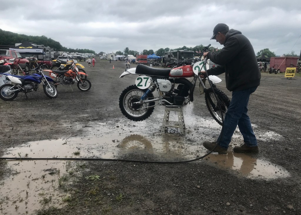 It wouldn’t be an outdoors summer race without a Dumpster full of E-Z Ups blasted to bits by Mother Nature. An inch of rain made Friday morning’s XC event a bit slippery, AHRMA Northeast organizer Bob Close said, but dedicated teams were out “in the woods until the sun went down making changes and fixes to the course.” He noted that facility ownership truly enjoys putting on Rewind and will listen to feedback and make adjustments as needed. A serious thunder and lightning storm during Friday’s scrambles would divert Close’s full attention to strictly racing his 1975 YZ125B on the national track the following day. Once one comes to terms with the bolt-throwing upper-hand Mount Olympus has over weather, the conclusion is inevitable: “You pick your battles,” he said.