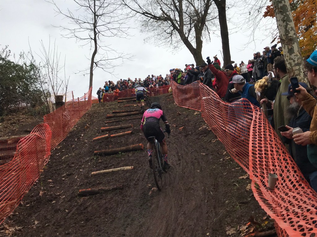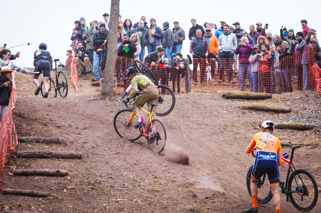 Every CX course should have “that” feature and the Fox Hole, an aptly-named pit of chaos and camaraderie, is it. It’s not fun to run and promoters somehow managed to make it even more difficult this year by putting another hill on top of their signature mountain. You hear it coming, a rowdy and menacing drone, before you actually see it and it flings you out of the frying pan and into the fire. With teeth clenched and legs burning no matter how you clamber to the peak, it’s lined with a hundred loosened-up fans verbally propelling you to the top and reminding me that I paid $50 to dry heave on lap two.